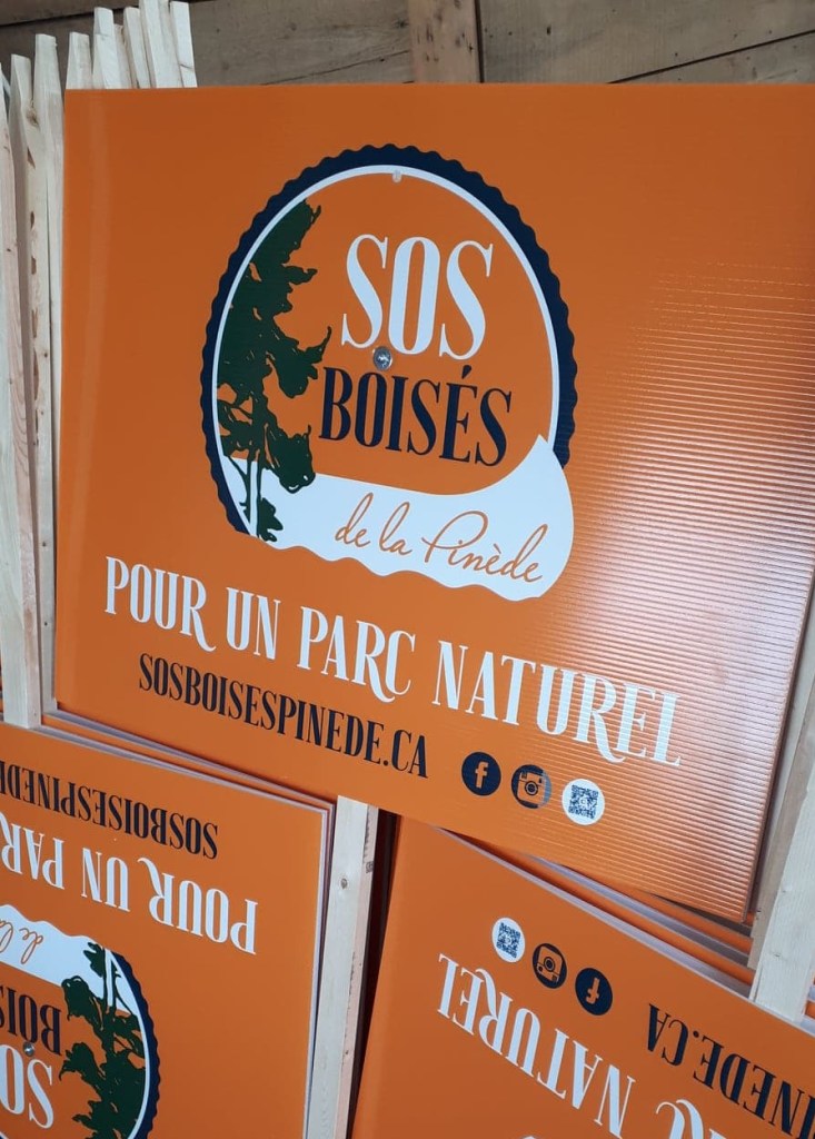 Dans le cadre de la campagne de visibilité #As-tu ta pancarte SOS Boisés? Nous vendons des pancartes aux couleurs de SOS Boisés de la Pinède qui permettent de faire connaître le projet de parc naturel, et par le fait même, d’afficher votre support pour la cause.
